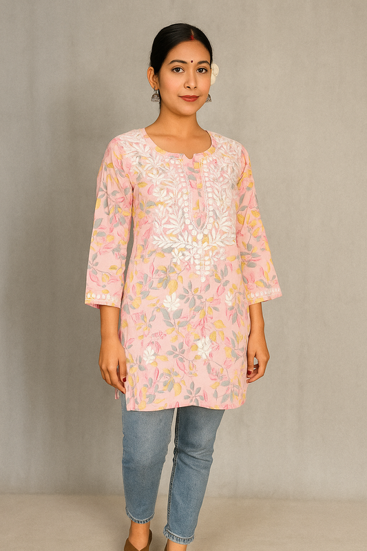 Lucknowi Chikankari Pink 'Shagufta' Printed Cotton Short Kurti-T000043