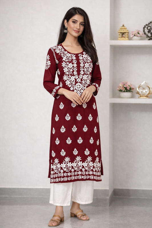 Lucknowi Chikankari Maroon Modal Kurti-K50077