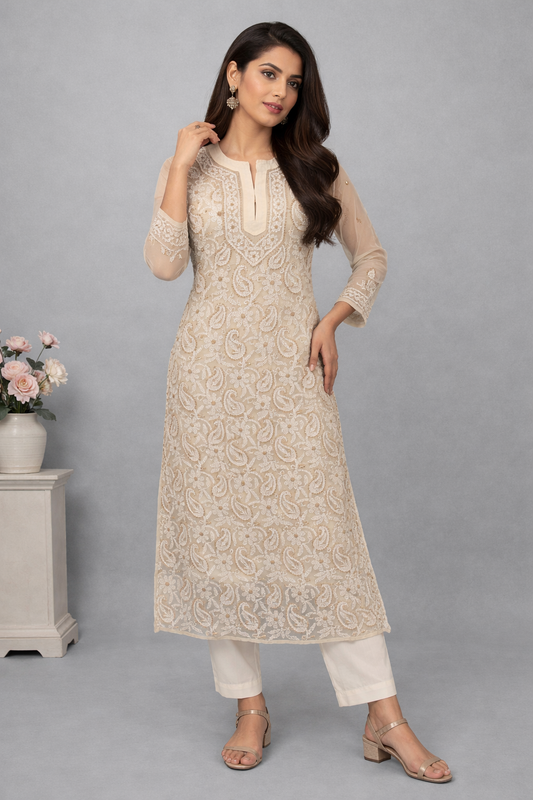 Lucknowi Chikankari Fawn 'Karimi' Georgette Kurti-K30056