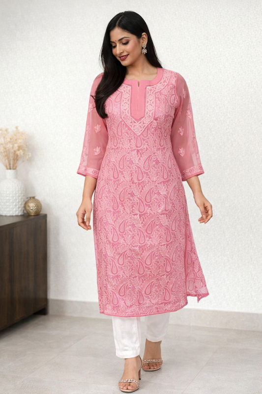 Lucknowi Chikankari Pink 'Shagufta' Georgette Kurti-K20005