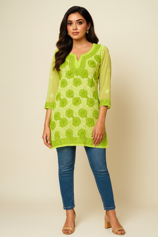 Lucknowi Chikankari Green 'Bahar' Georgette Short Kurti-T30007