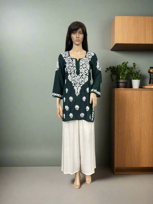 Lucknowi Chikankari Green Modal Short Kurti-T000045