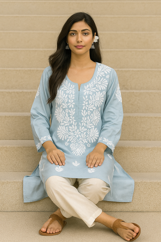 Lucknowi Chikankari Blue 'Aab-e-Asmaan' Modal Short Kurti-T000054
