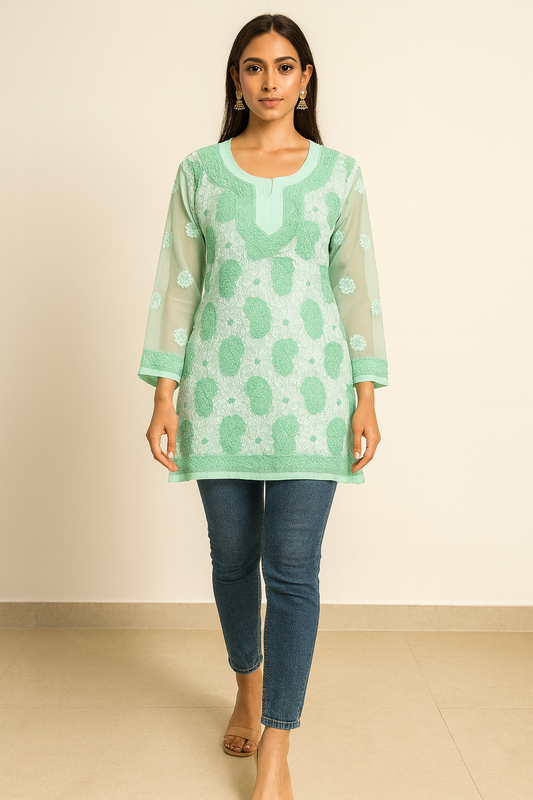 Lucknowi Chikankari Green 'Bahar' Georgette Short Kurti-T40001