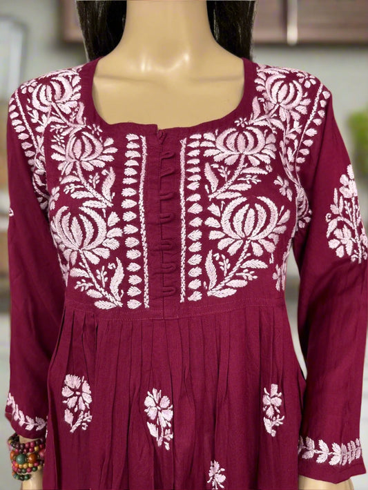 Lucknowi Chikankari Maroon Modal Short Kurti-T000039