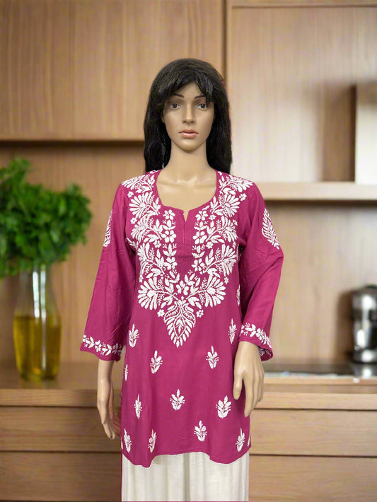 Lucknowi Chikankari Magenta Modal Short Kurti-T000048