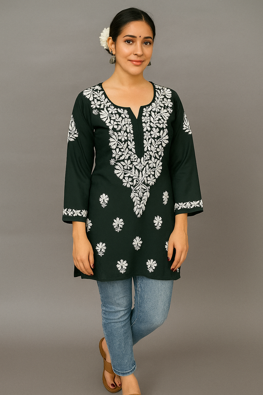 Lucknowi Chikankari Green 'Bahar' Modal Short Kurti-T000045