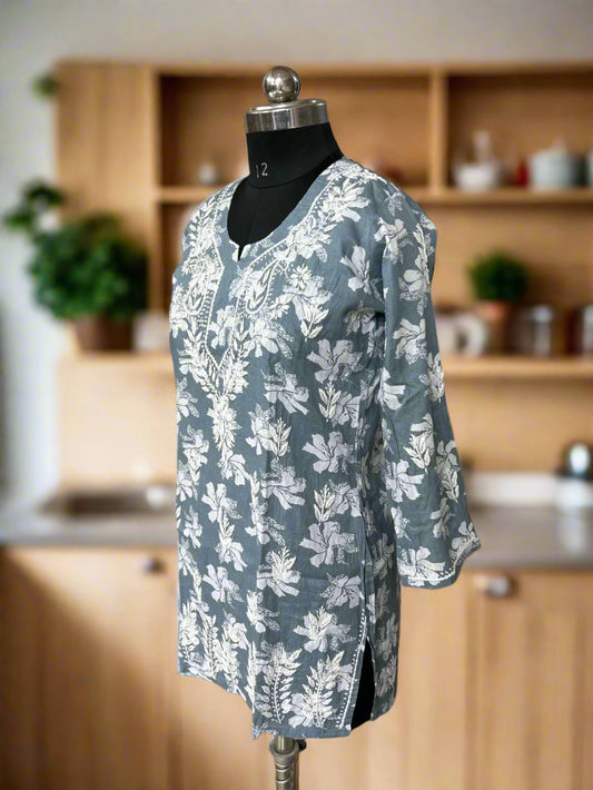 Lucknowi Chikankari Grey Printed Cotton Short Kurti-T000028