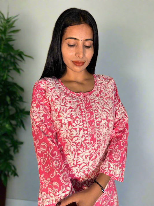 Lucknowi Chikankari Pink Printed Cotton Short Kurti-T000021