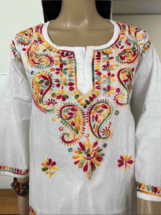 Lucknowi Chikankari White Cotton Short Kurti-T000027