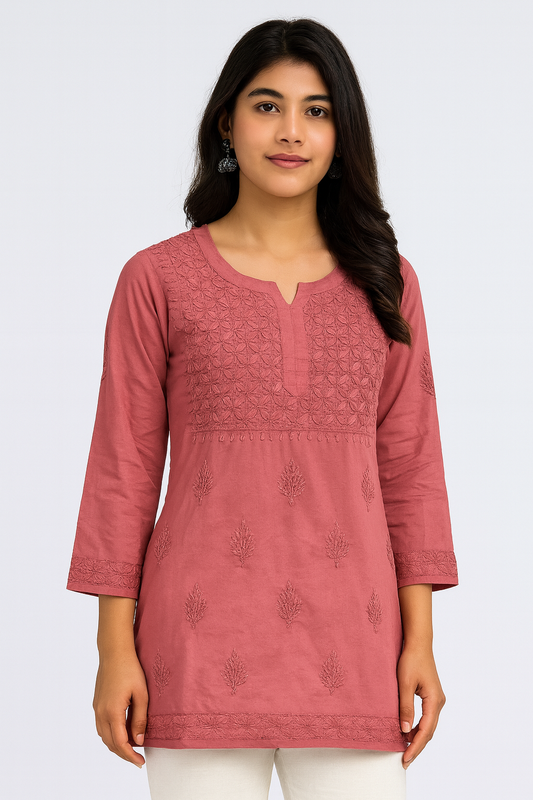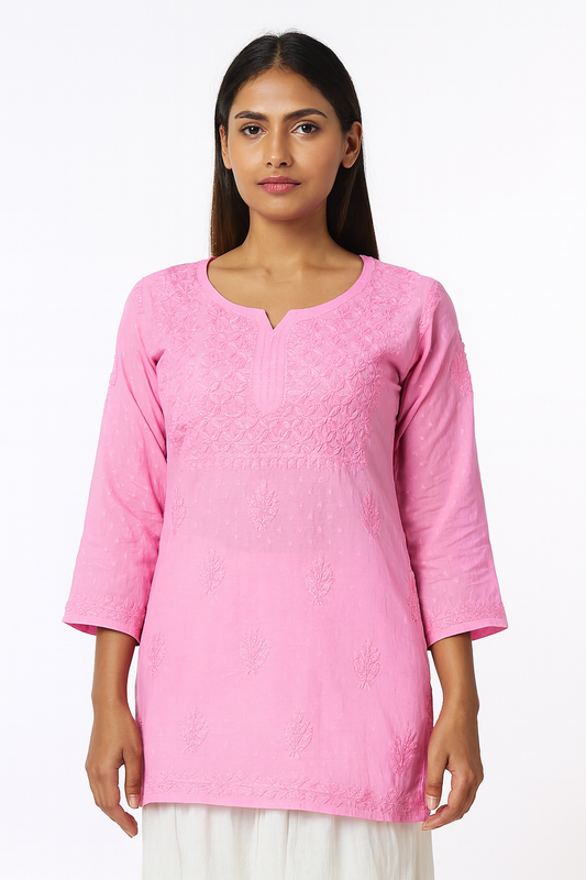 Lucknowi Chikankari Pink 'Shagufta' Cotton Short Kurti-T30016