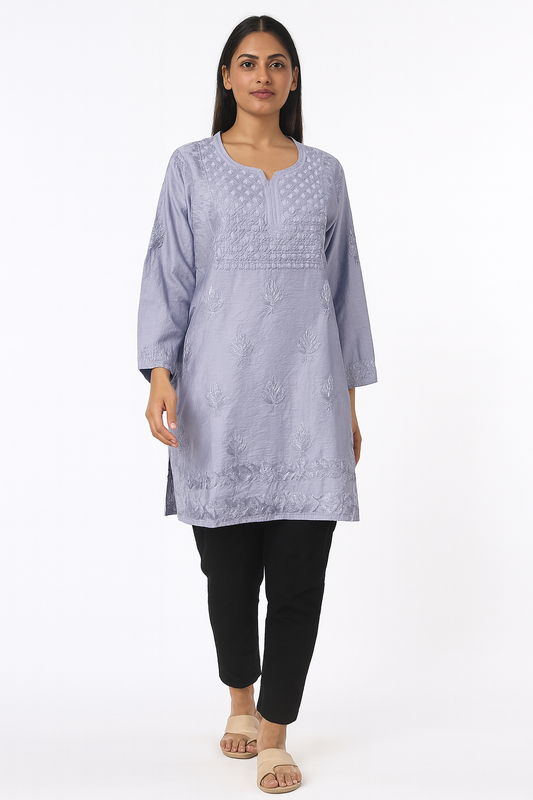 Lucknowi Chikankari Grey 'Dhoondhla' Chanderi Short Kurti-T30017