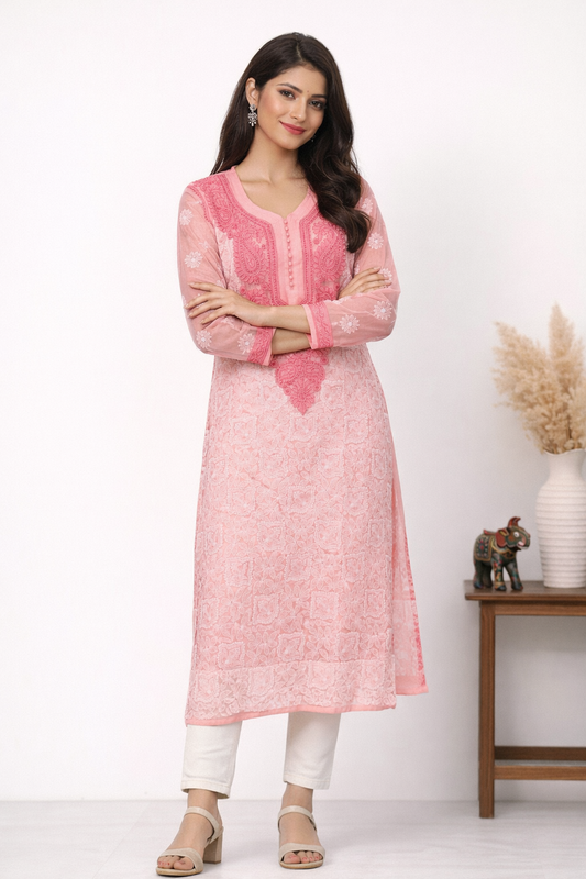 Lucknowi Chikankari Coral Pink 'Shagufta' Georgette Kurti-K40041