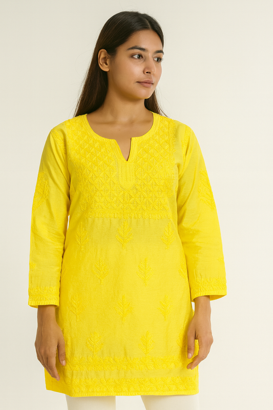 Lucknowi Chikankari Yellow 'Sunehri' Chanderi Short Kurti-T30018