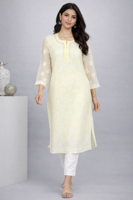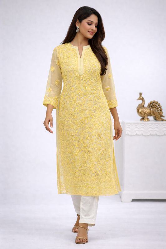 Lucknowi Chikankari Yellow 'Sunehri' Georgette Kurti-K30021