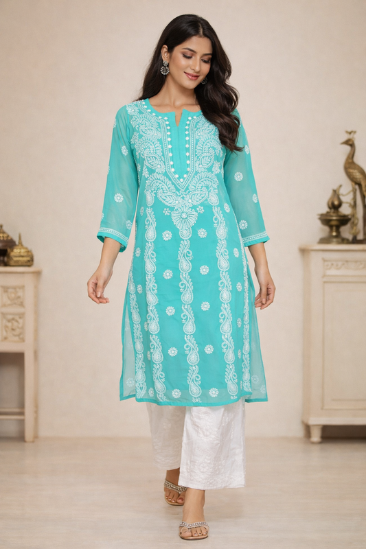 Lucknowi Chikankari Green 'Bahar' Georgette Kurti-K30015