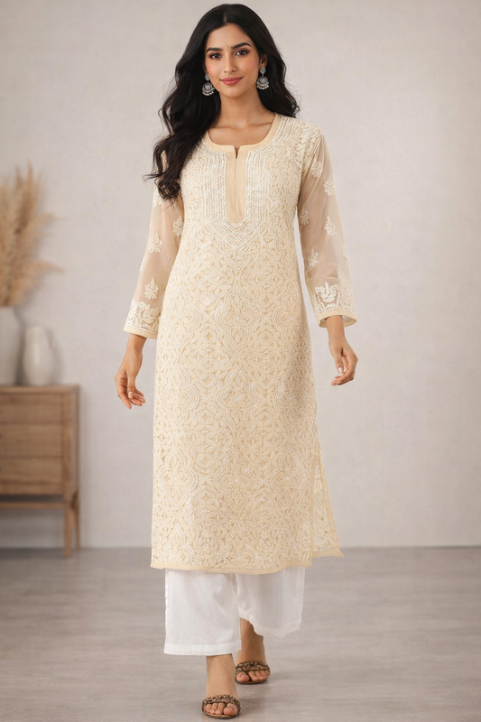 Lucknowi Chikankari Cream 'Karimi' Georgette Kurti-K30047