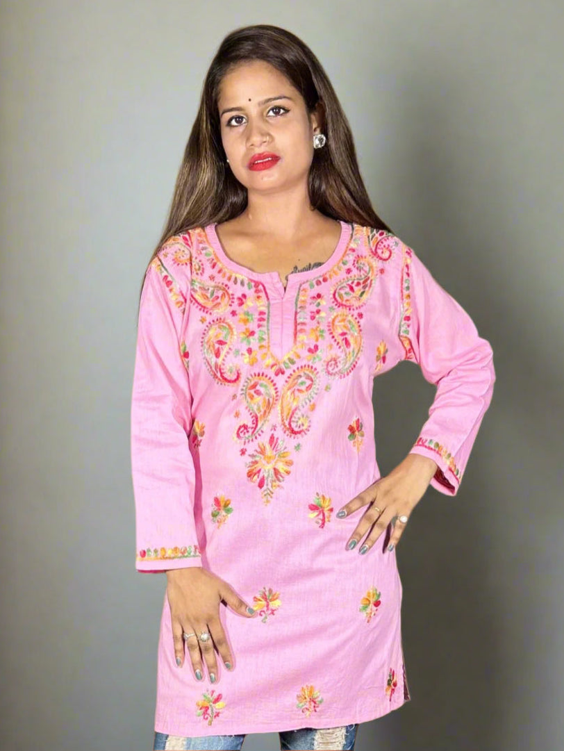 Lucknowi Chikankari Baby Pink Cotton Short Kurti-T000009
