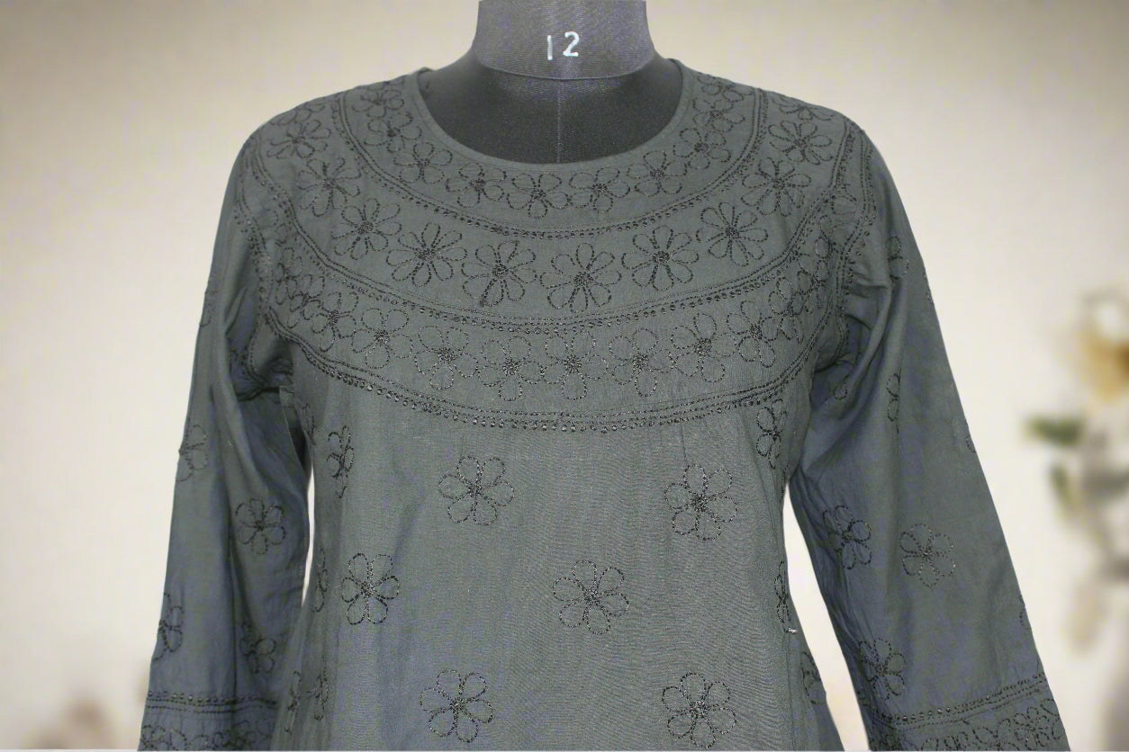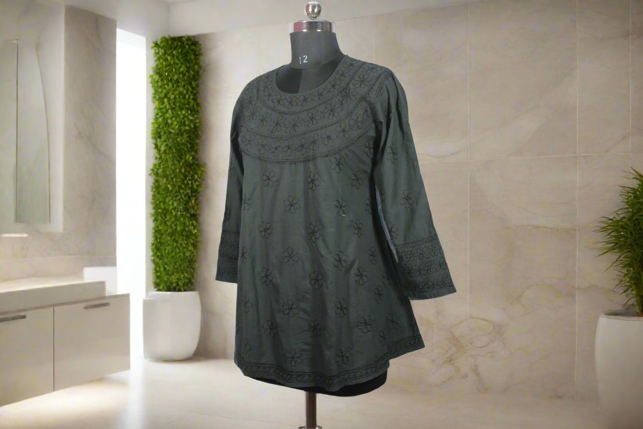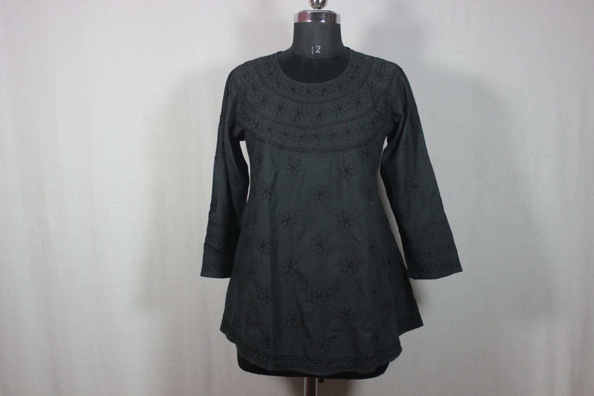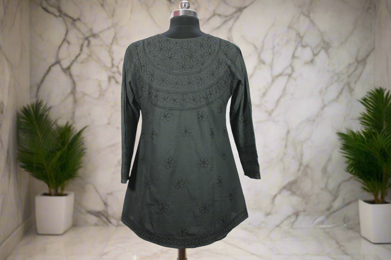 Lucknowi Chikankari Black Cotton Short Kurti-T50001