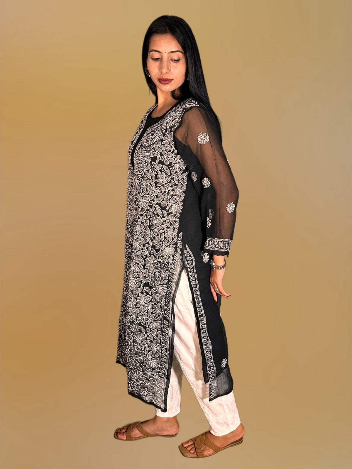 Lucknowi Chikankari Black Georgette Kurti-K000053