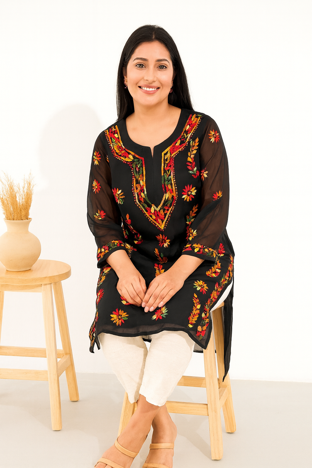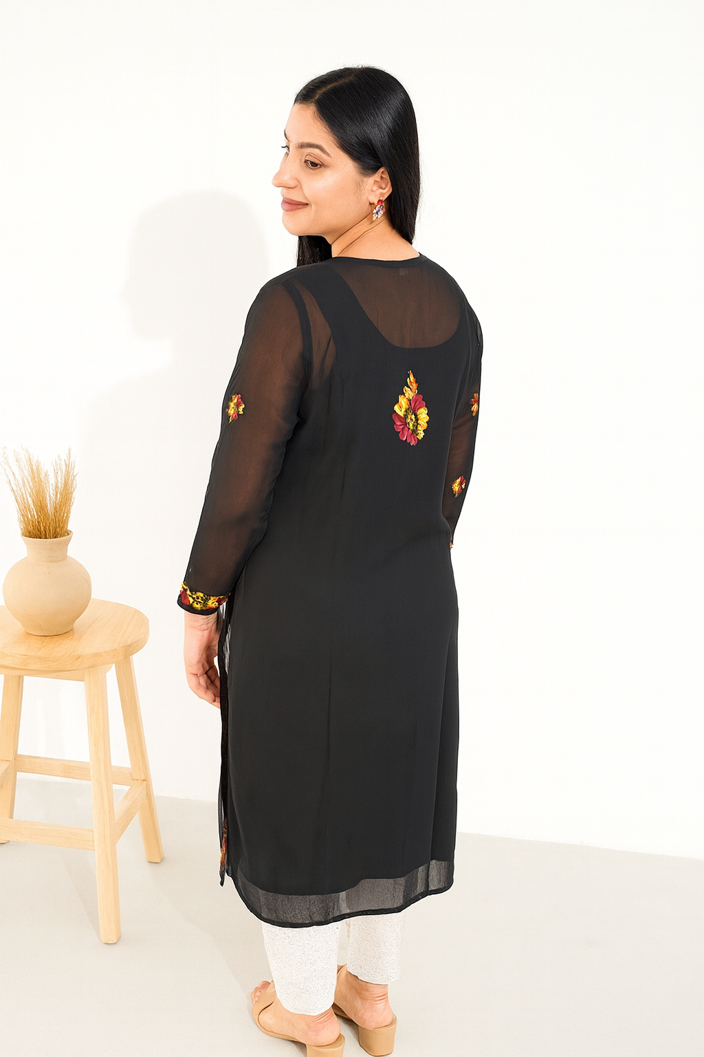 This black sheer georgette kurti is a striking canvas where colors truly come alive. The deep black base enhances and lets every multicolored chikankari motif dance with vibrance and clarity. Designed with a linear placement of embroidery, the kurti creates a visually elongated silhouette, lending a tall and graceful look to the wearer.