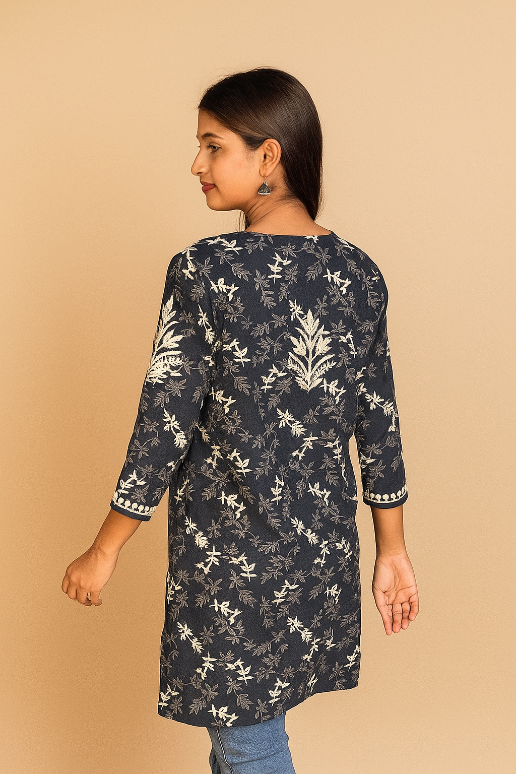 Lucknowi Chikankari Black 'Siah' Printed Rayon Short Kurti-T000003