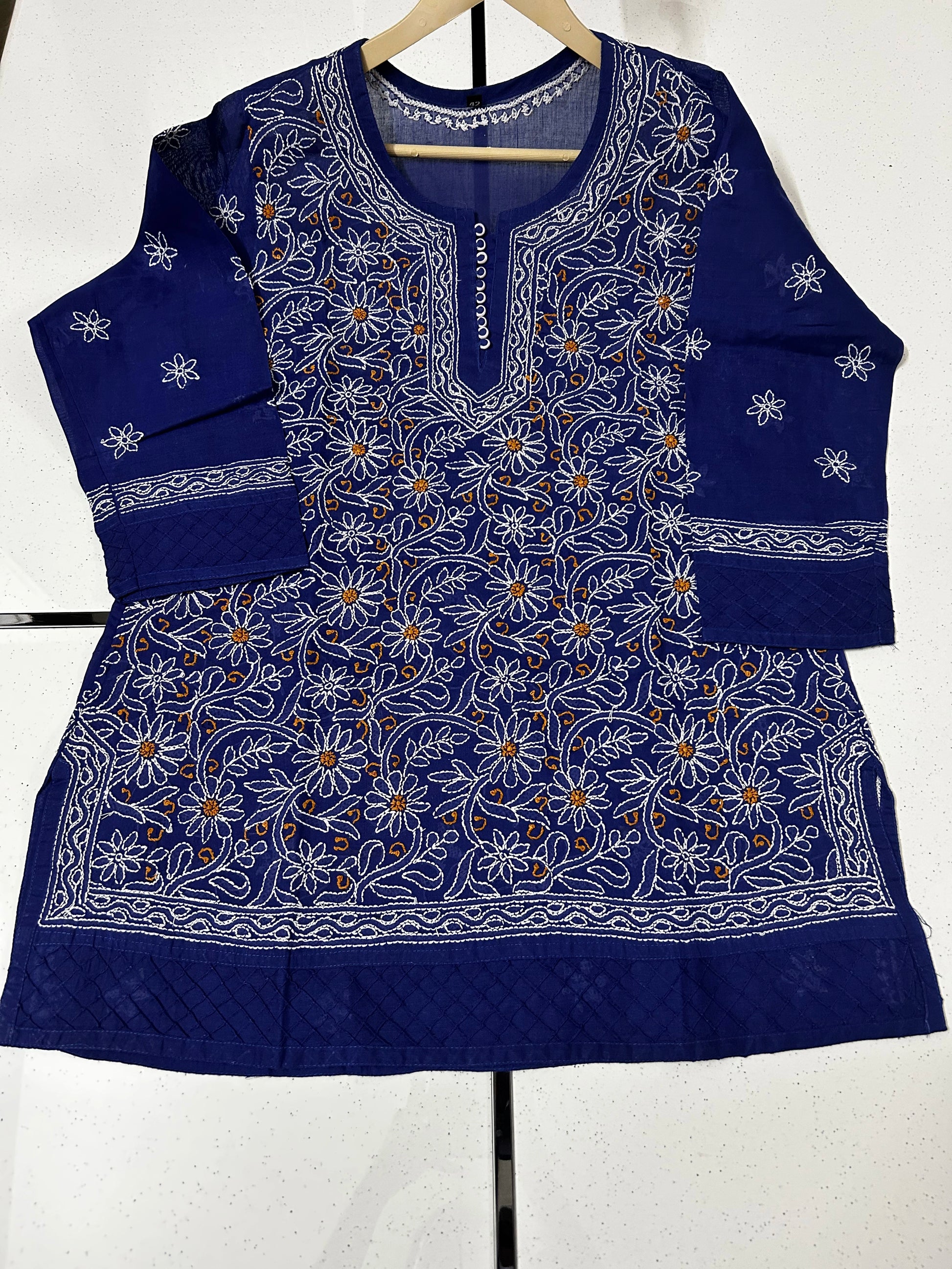 Crafted from soft cotton, the Lucknowi Chikankari Blue Cotton Short Kurti blends traditional embroidery with modern style. Its intricate chikankari work adds elegant texture, while the breathable fabric ensures comfort throughout the day. Perfect for casual outings or professional settings, this kurti offers a sophisticated yet effortless look that highlights expert craftsmanship.