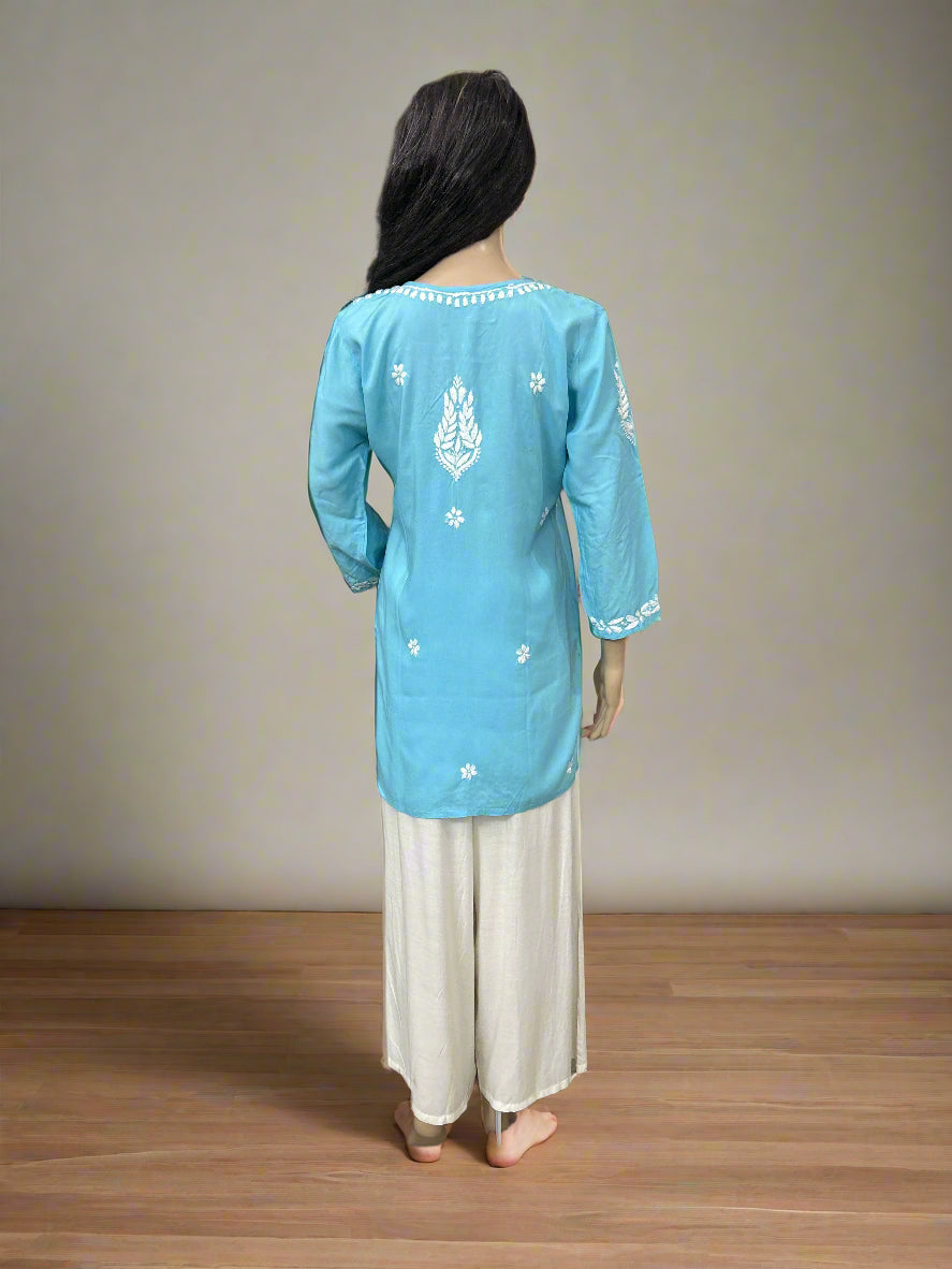 Expertly crafted with soft blue modal fabric, this Lucknowi Chikankari short kurti adds elegance and comfort to your wardrobe. The intricate hand embroidery of Chikankari adds a unique touch, making it perfect for any occasion. Elevate your style with this timeless piece.