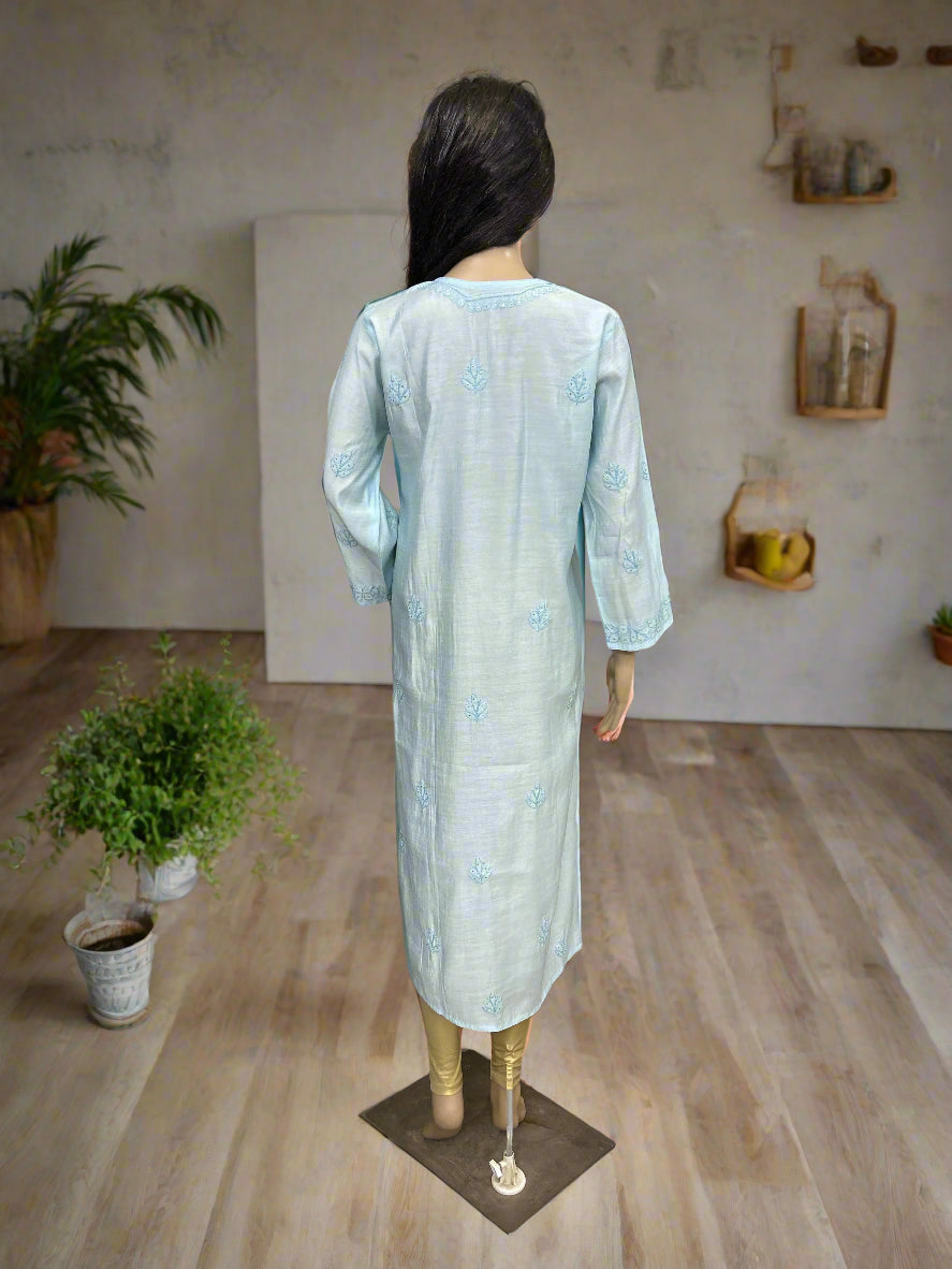 Lucknowi Chikankari Blue Chanderi Kurti-K000174