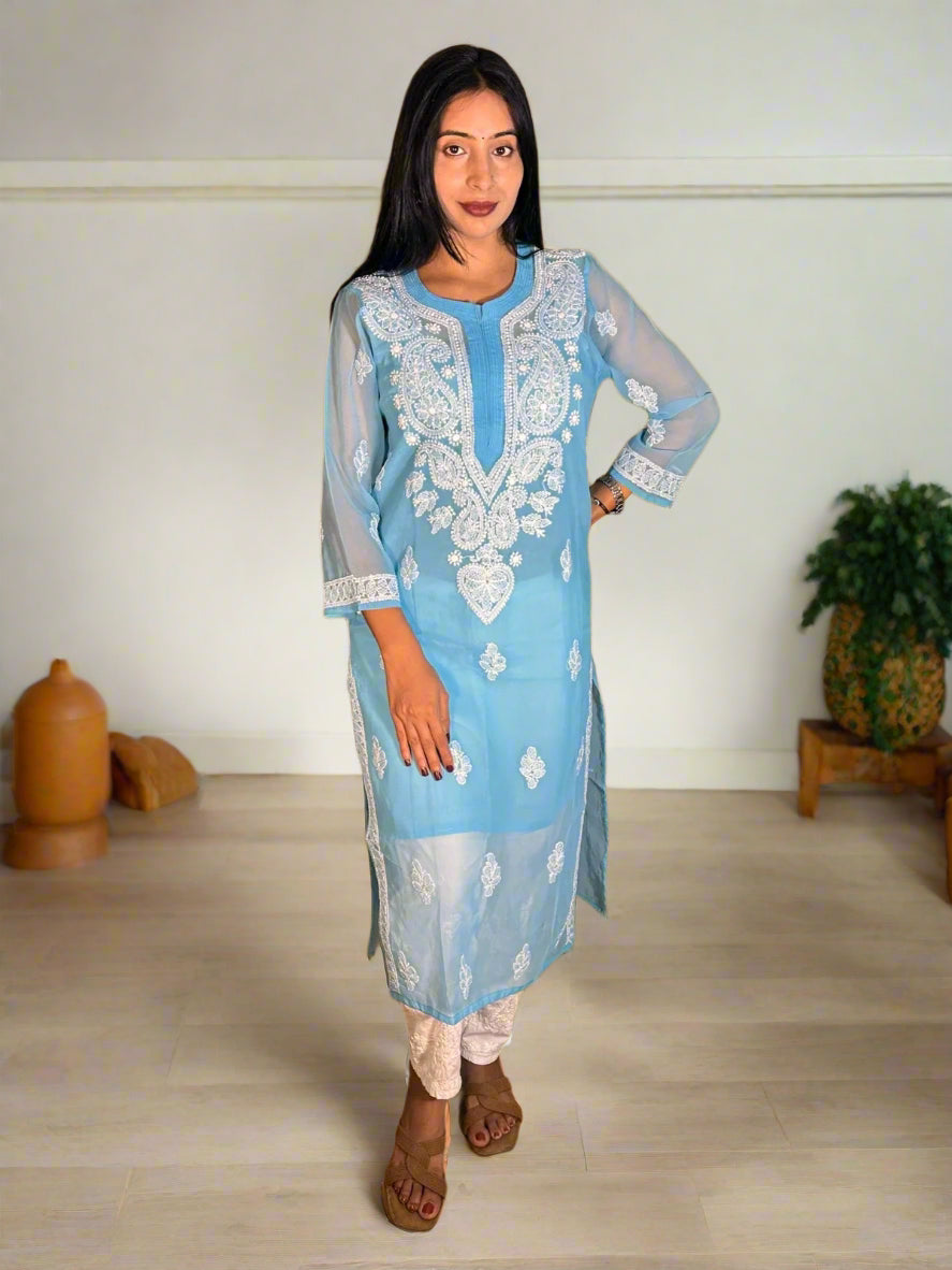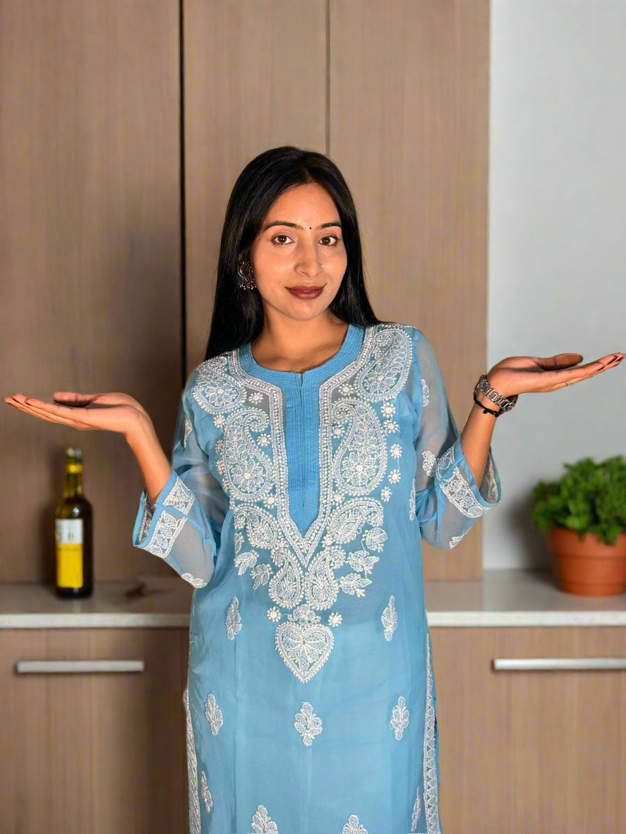 Lucknowi Chikankari Blue Georgette Kurti-K000061