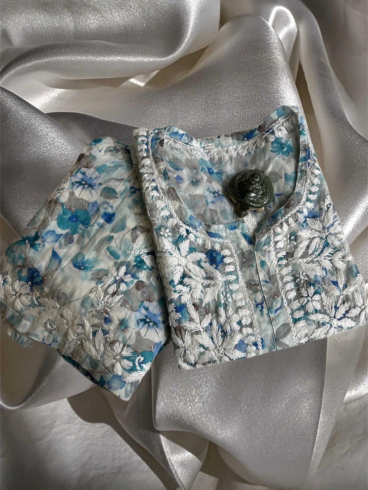Lucknowi Chikankari Blue Printed Cotton Kurta Bottom Set-Kb00003