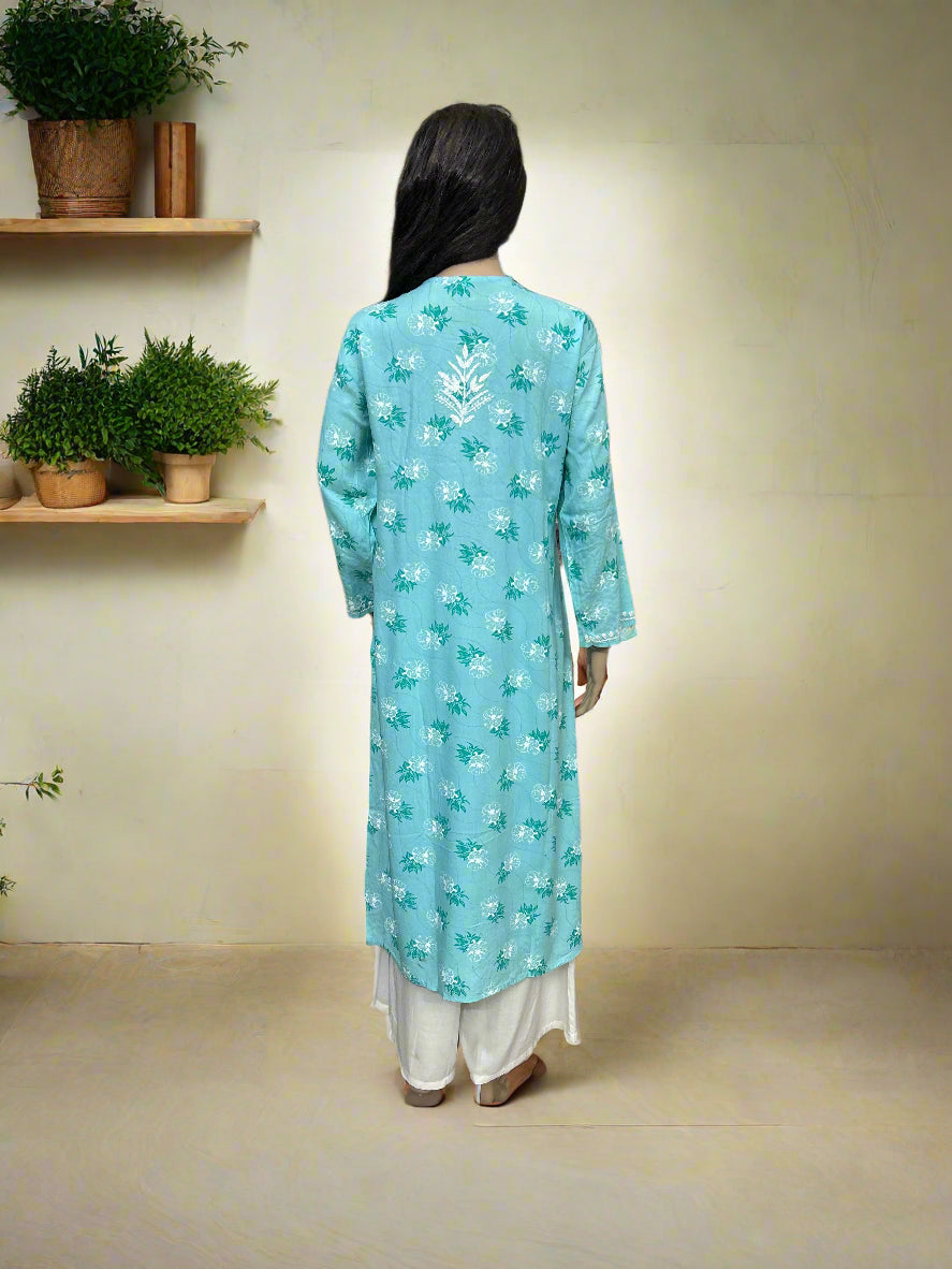 Lucknowi Chikankari Blue Printed Rayon Kurti-K000075