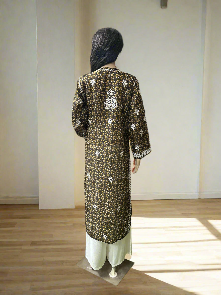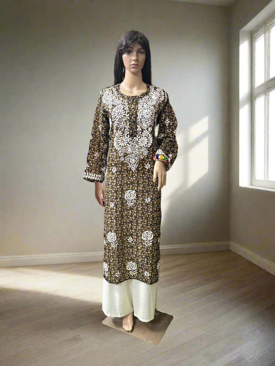 Lucknowi Chikankari Brown Printed Faux Kota Kurti-K000126