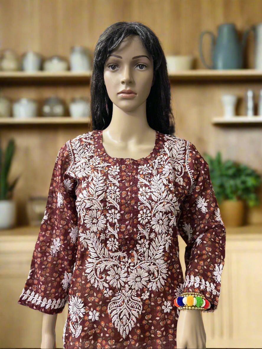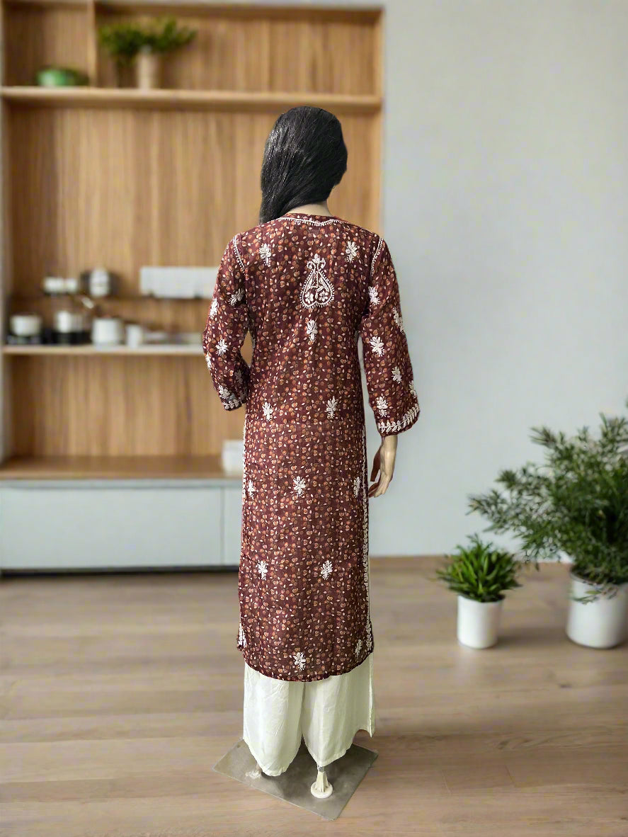 Lucknowi Chikankari Coke Printed Faux Kota Kurti-K000123