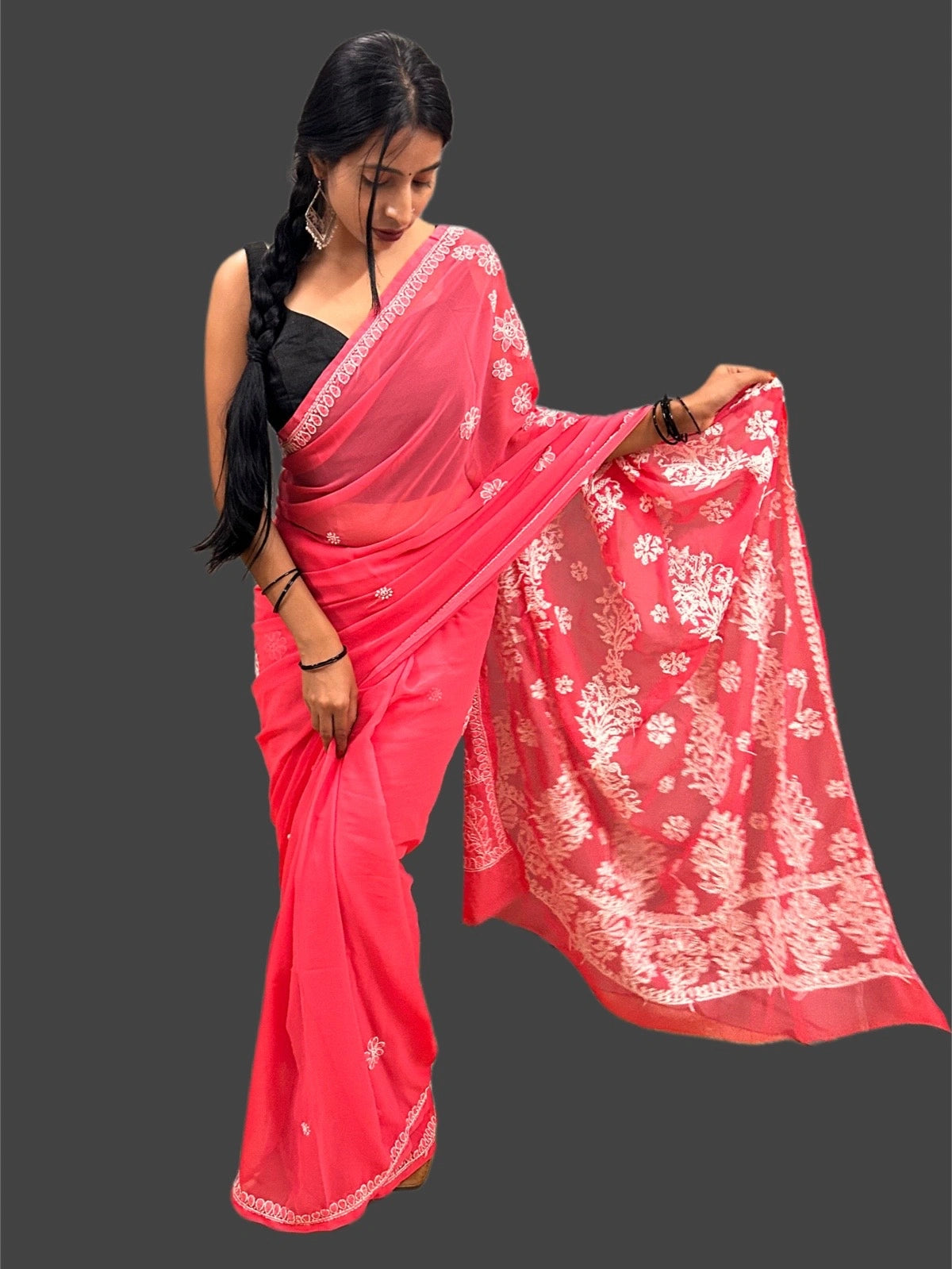 Lucknowi Chikankari Coral Pink Georgette Saree (With Blouse)-S00005