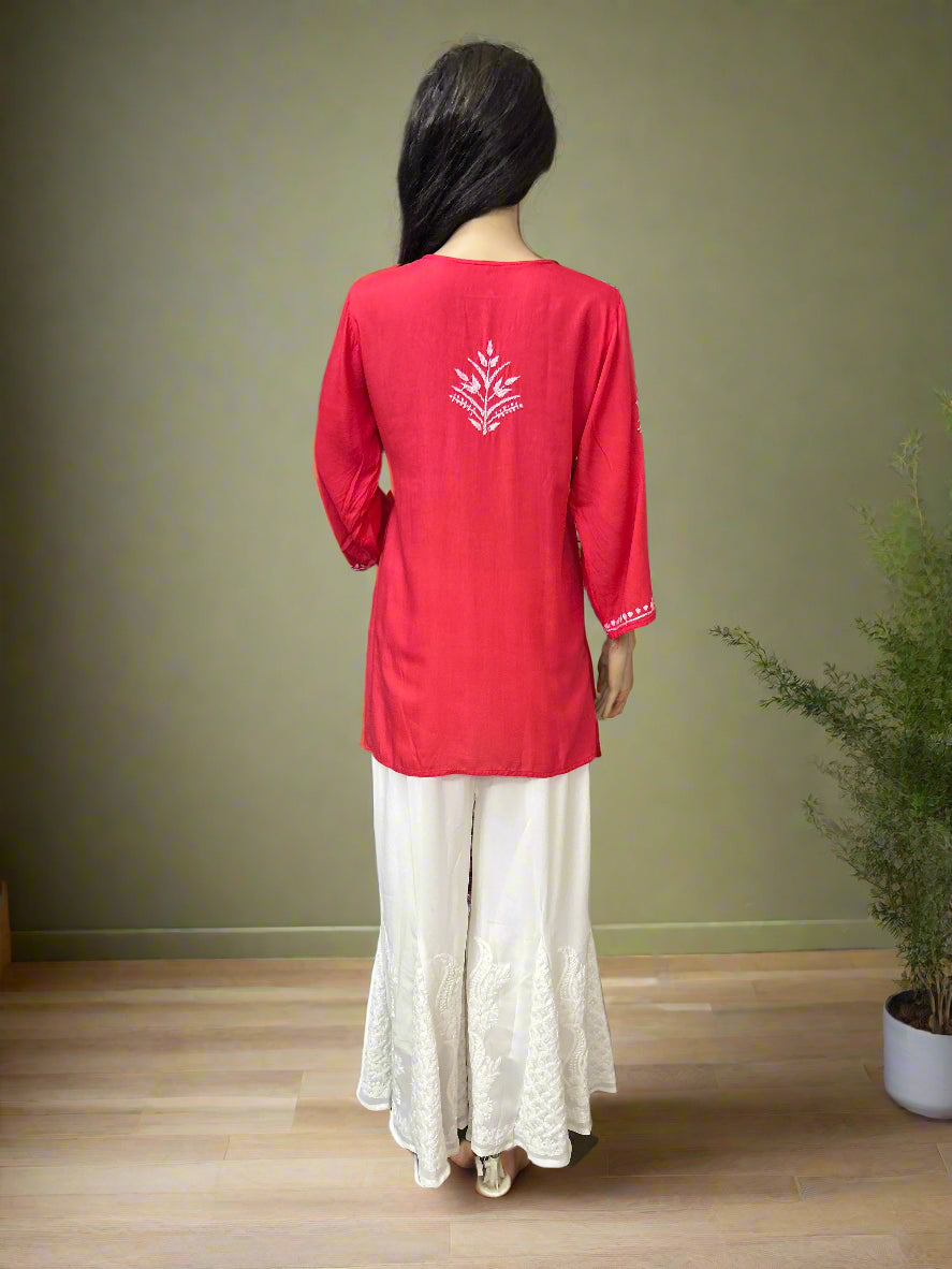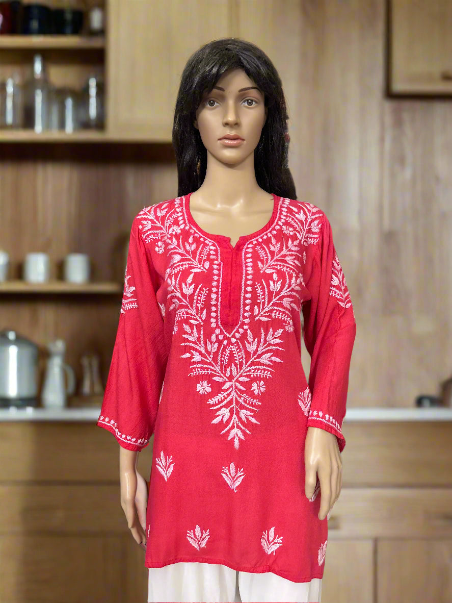 Lucknowi Chikankari Coral Pink Rayon Short Kurti-T000073