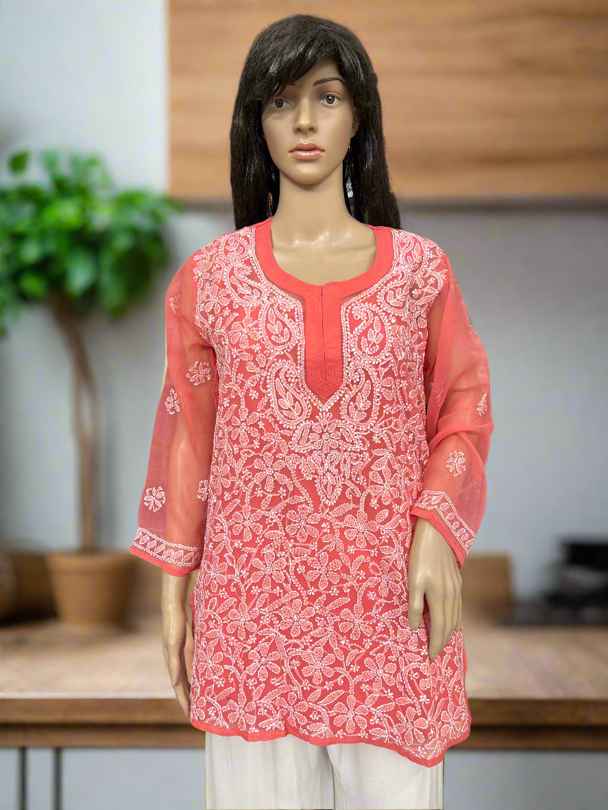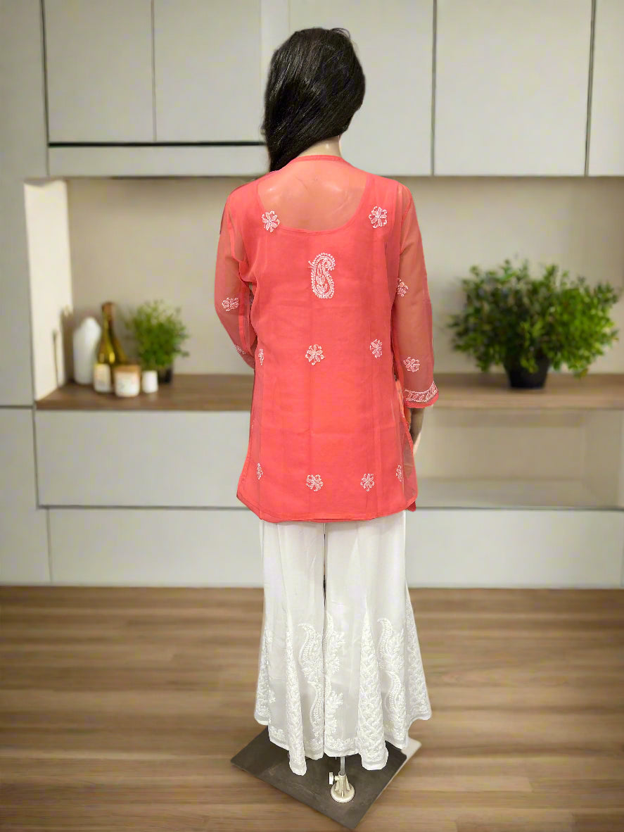 Lucknowi Chikankari Coral Pink Georgette Short Kurti-T40010