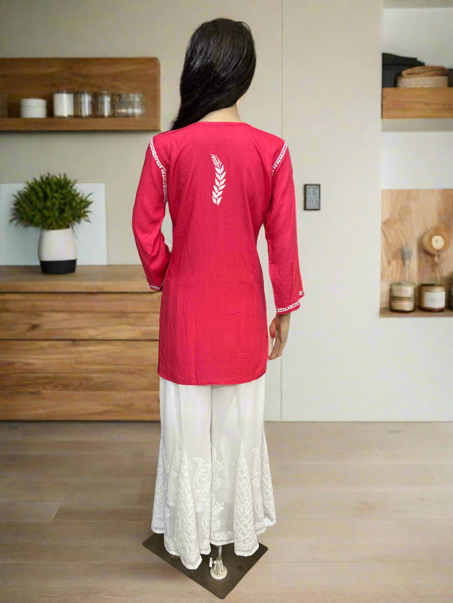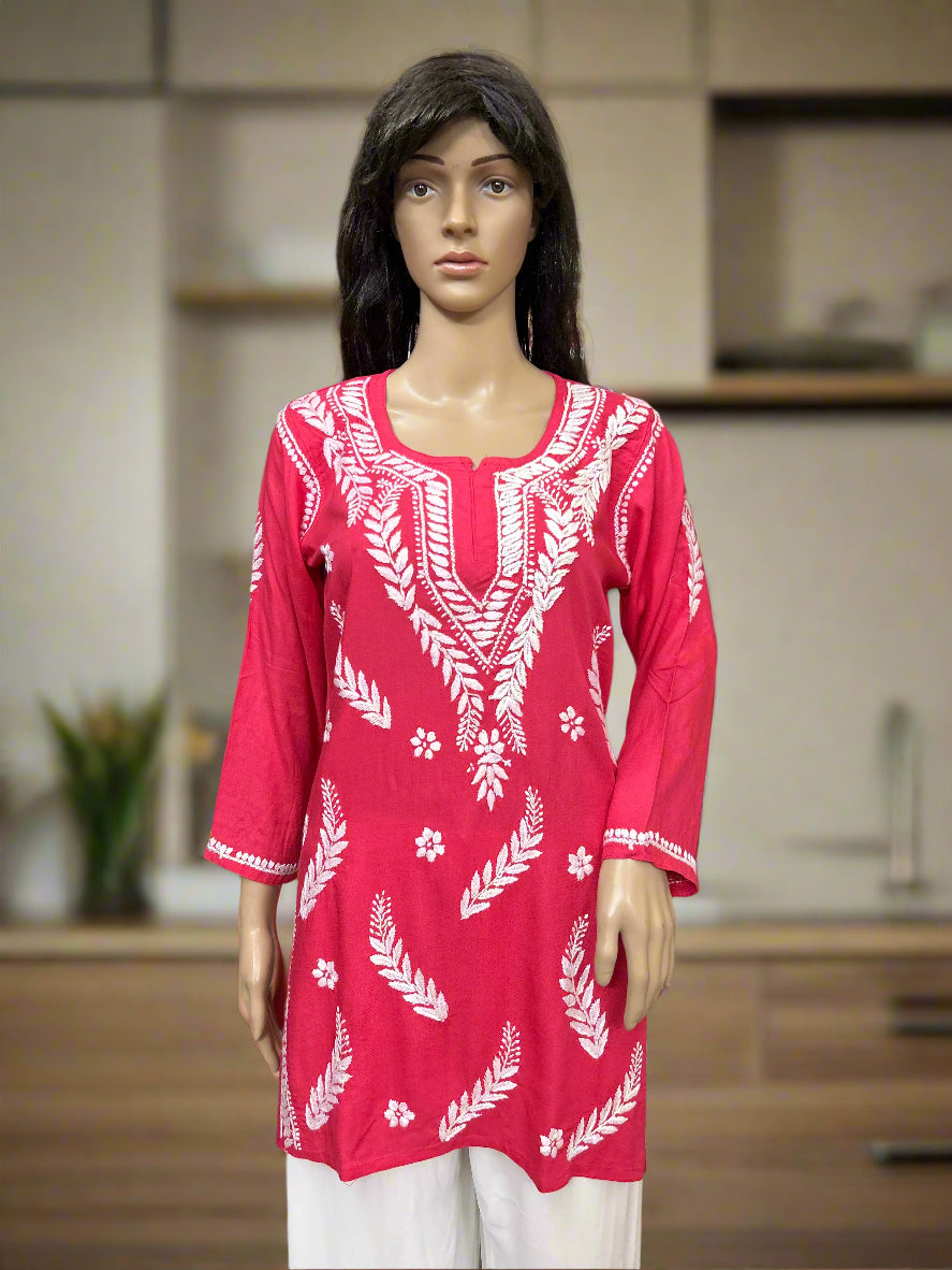 Lucknowi Chikankari Coral Pink Rayon Short Kurti-T2003