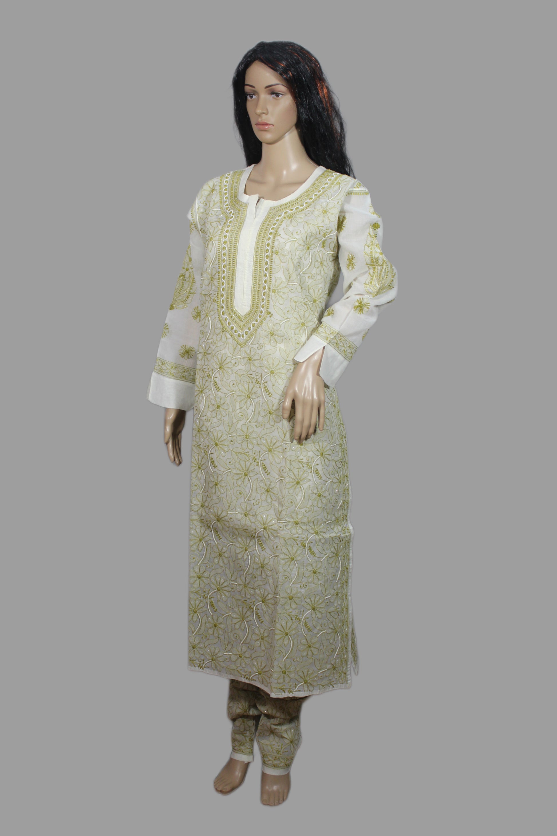 Lucknowi Chikankari Cream Cotton 3 Piece Kurta-Chudidar Pyjama-Dupatta Set-PJ00008