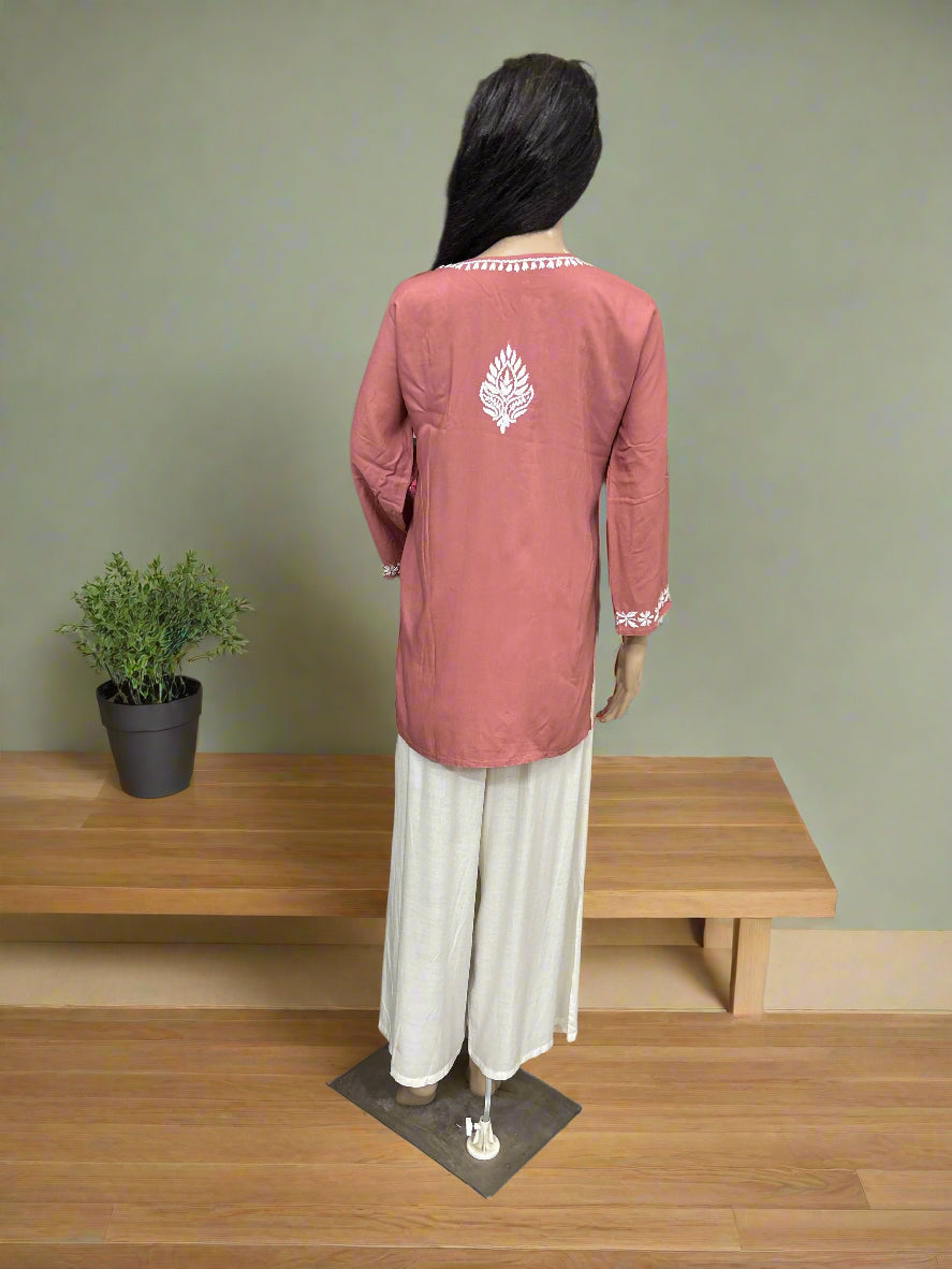 Lucknowi Chikankari Dusty Rose Modal Short Kurti-T50005