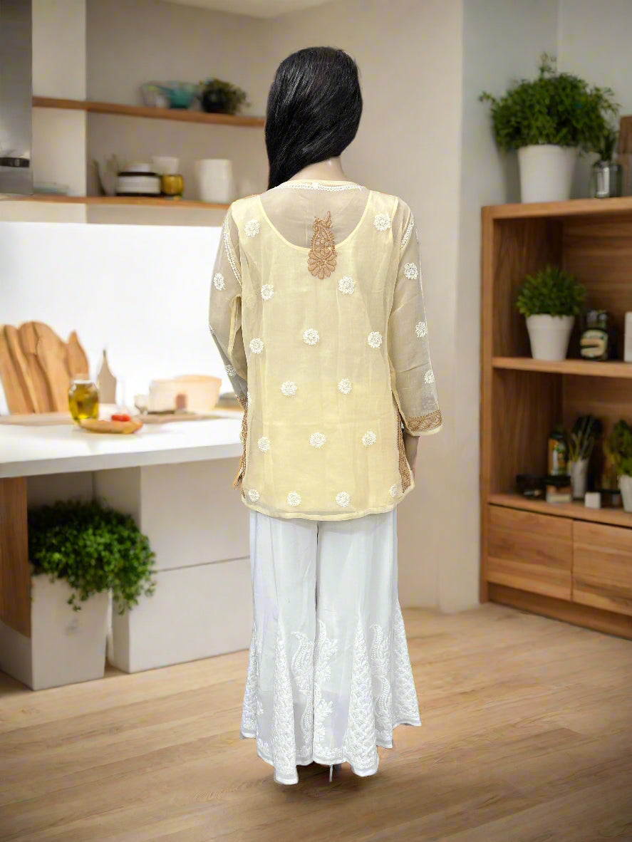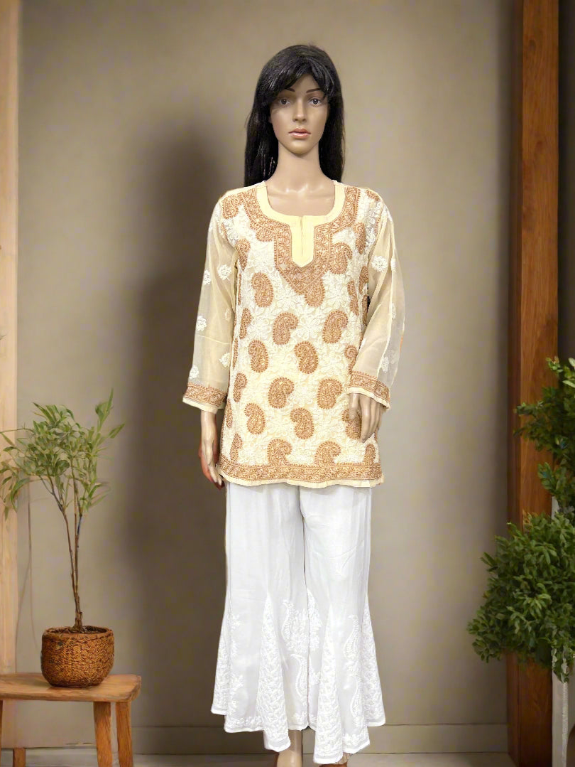 Lucknowi Chikankari Fawn Georgette Short Kurti-T40011