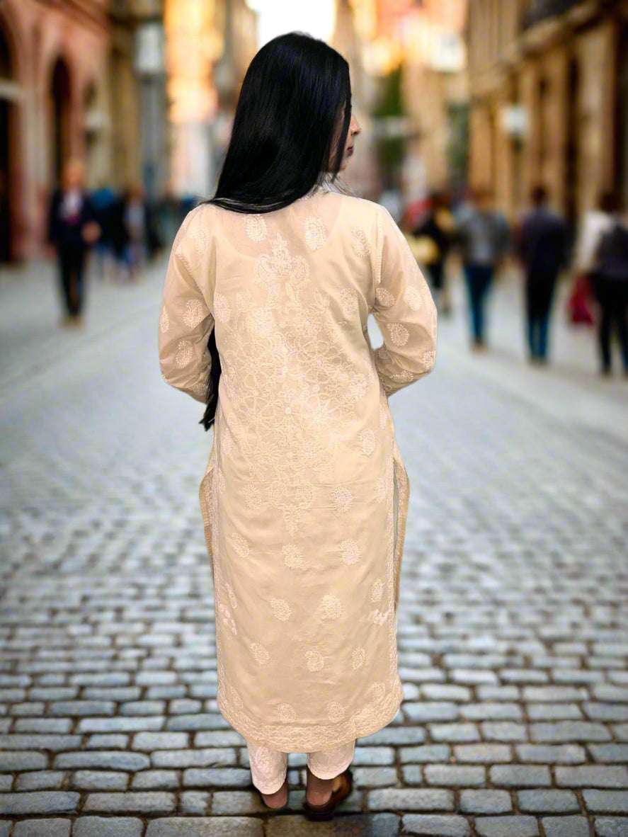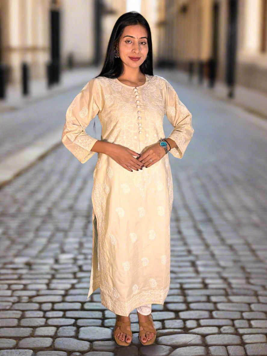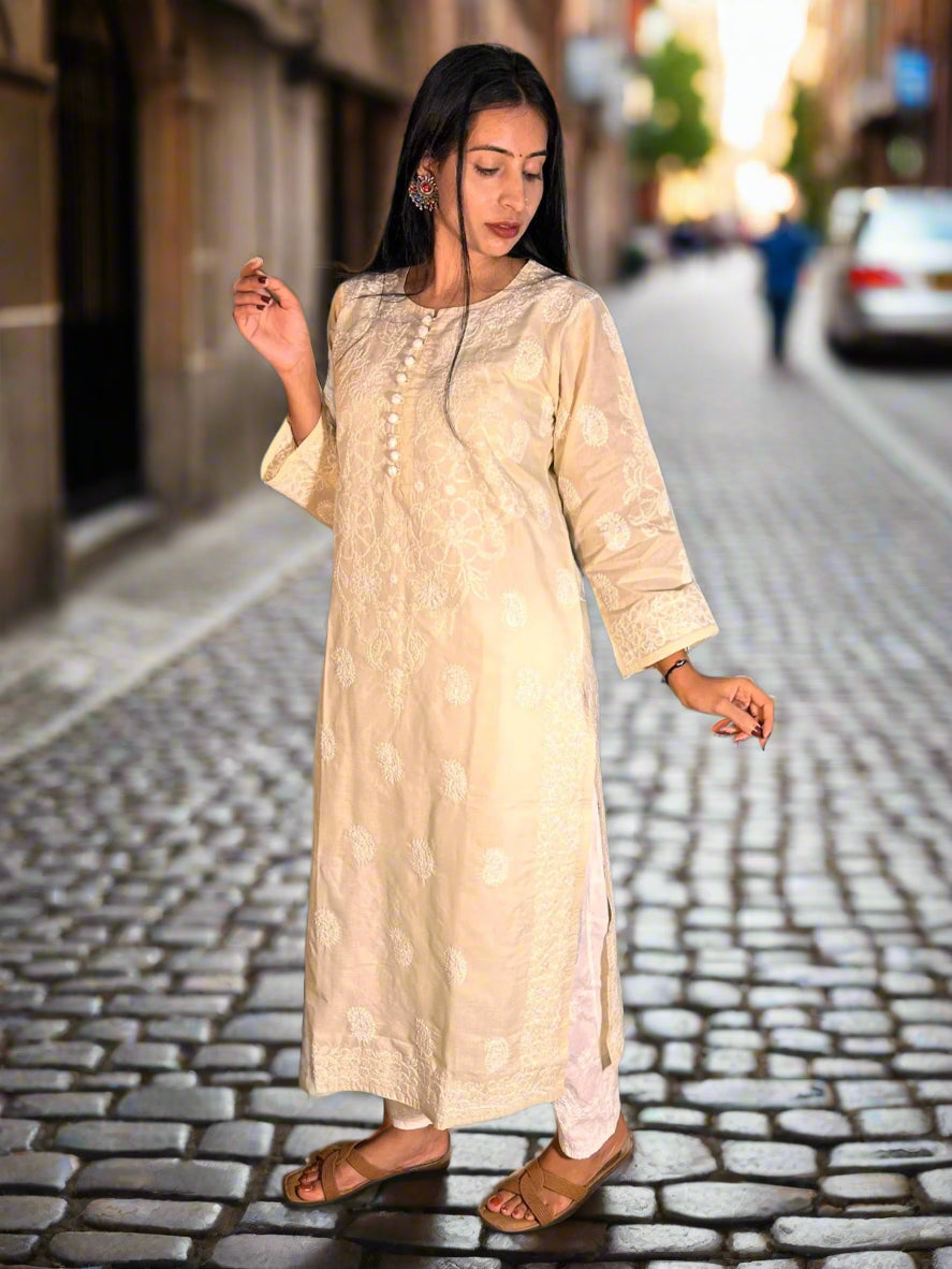 Lucknowi Chikankari Fawn 'Harnai Rang' Cotton Kurti-K40095