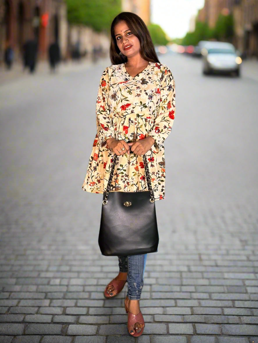 Indulge in the classic elegance of Lucknowi chikankari with our Fawn Printed Cotton Angrakha Styled Short Kurti. This short kurti showcases the traditional chikan embroidery technique in a modern twist, making it a perfect blend of culture and fashion. Made with high-quality cotton, it offers comfort and style.
