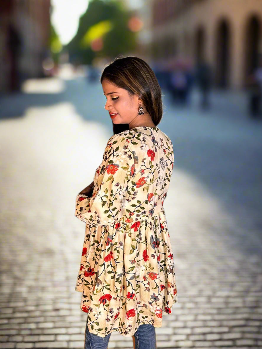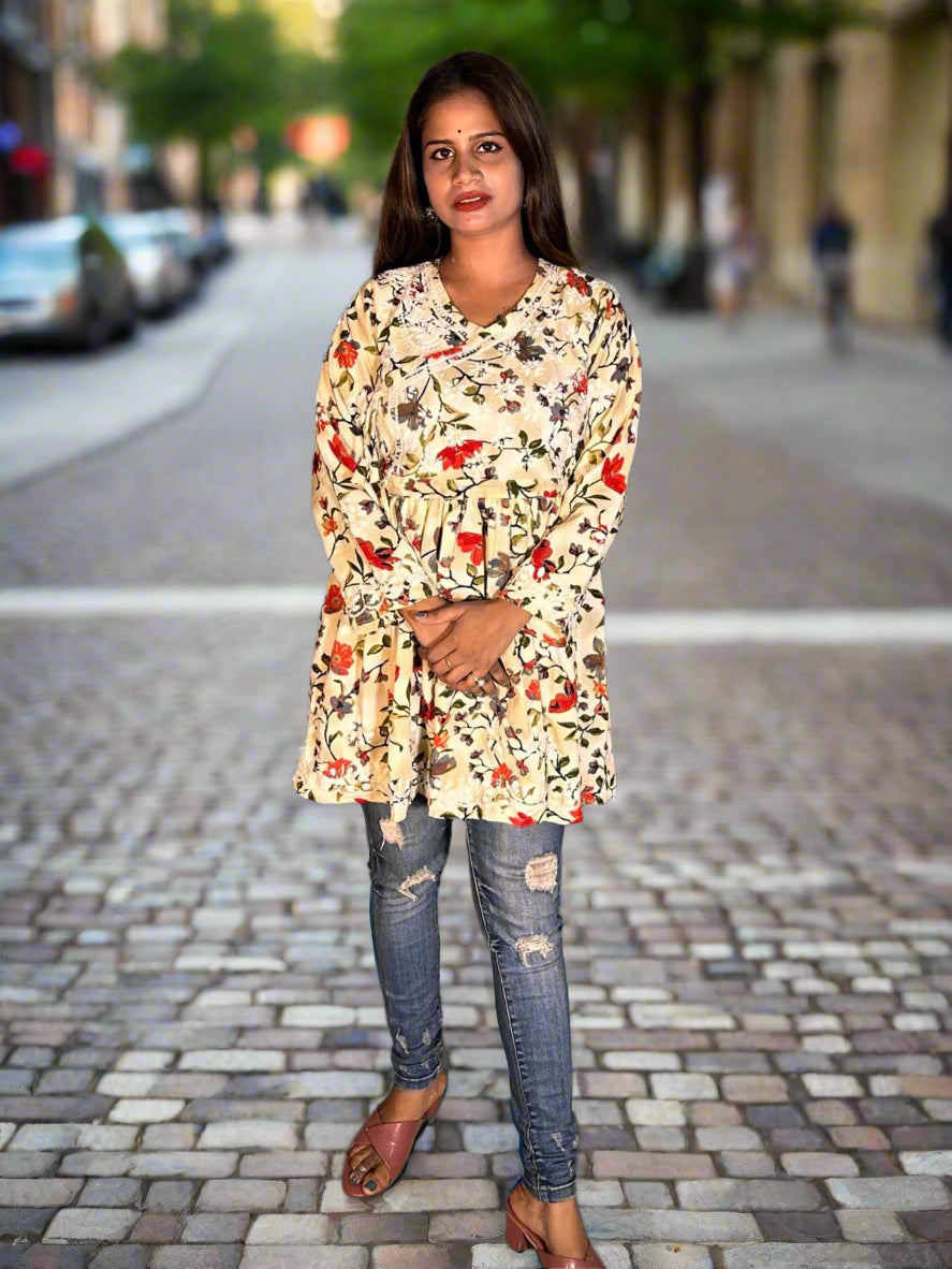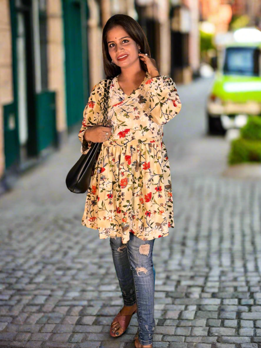 Lucknowi Chikankari Fawn Printed Cotton Angrakha Styled Short Kurti-T30002