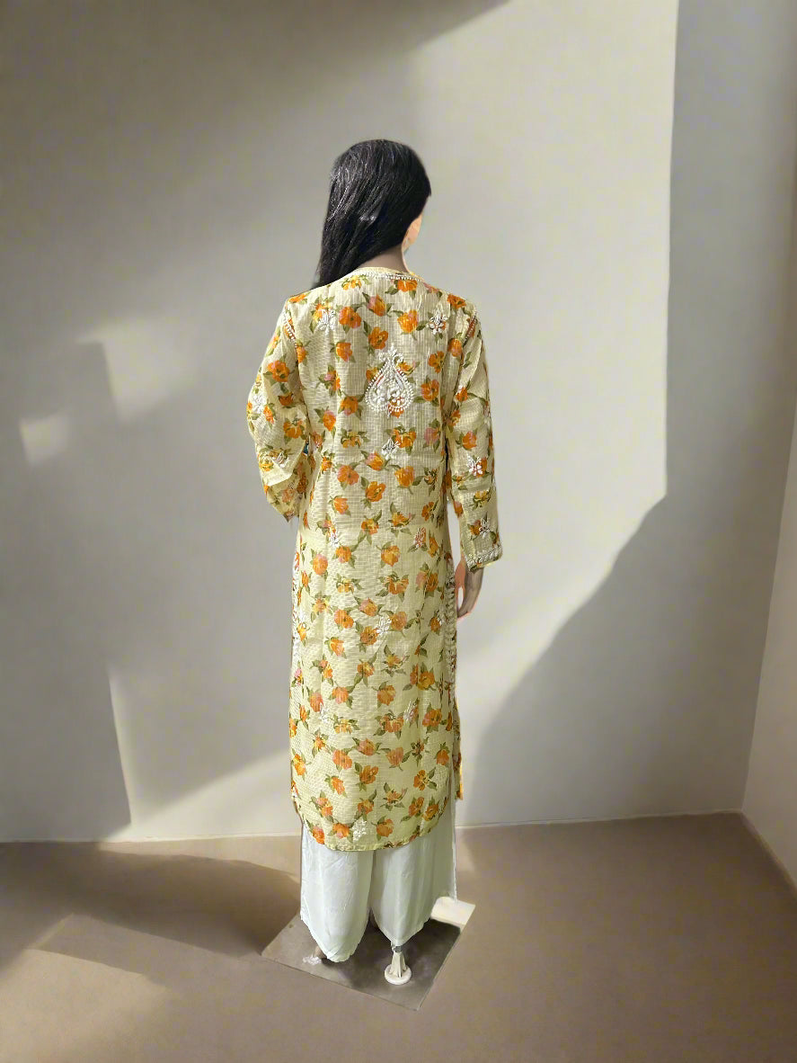Lucknowi Chikankari Fawn Printed Faux Kota Kurti-K000127