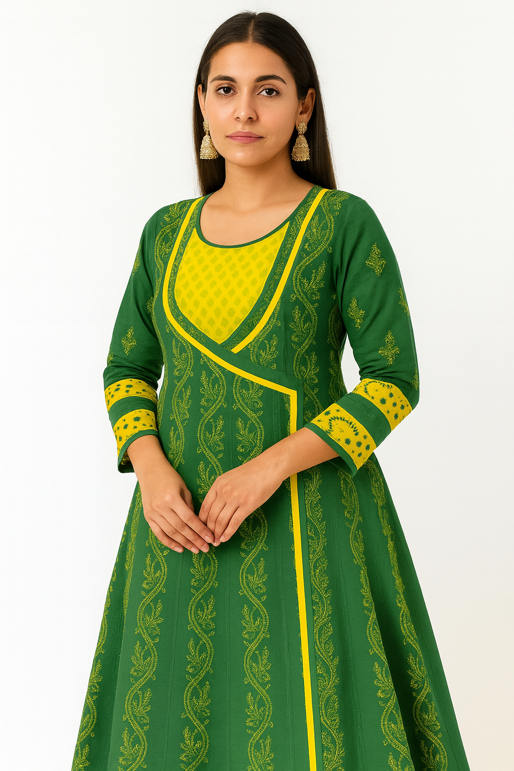 Step into the grandeur of the Mughal era with this stunning angrakha-style Anarkali kurti, a silhouette once adored by royalty. Designed in a rich shade of green with striking yellow detailing, this piece beautifully blends traditional charm with contemporary elegance. Golden chudidar with Dupatta in chiffon/organza with zari or gota work in yellow/golden tones will be the classic royal pairing.