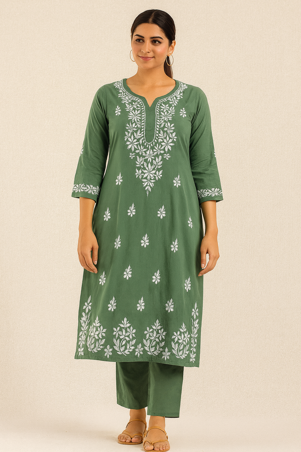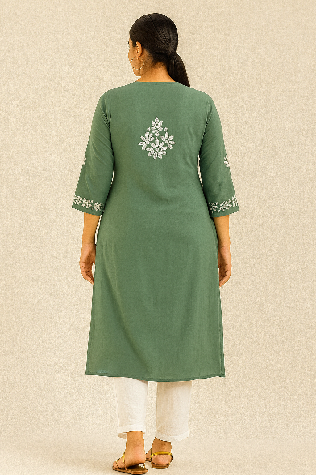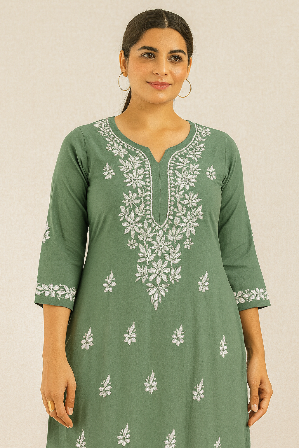 Disclaimer: This product is being processed using AI; Embroidery motifs and patterns in the image may differ from actual. Each kurti is uniquely hand-embroidered by artisans, and natural variations in motifs design are a hallmark of genuine work. Customers are assured of receiving an authentic handmade product, though it may not be an exact replica of visual. No rights are claimed over likeness of the model depicted in this AI-generated image.
