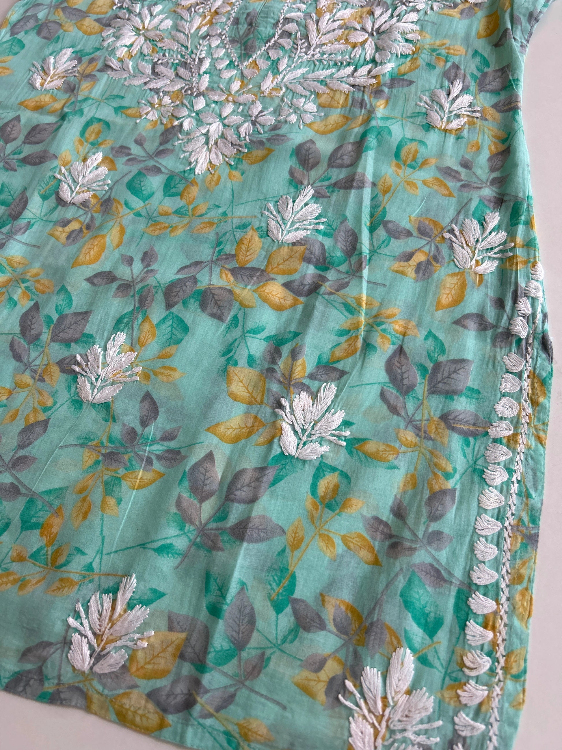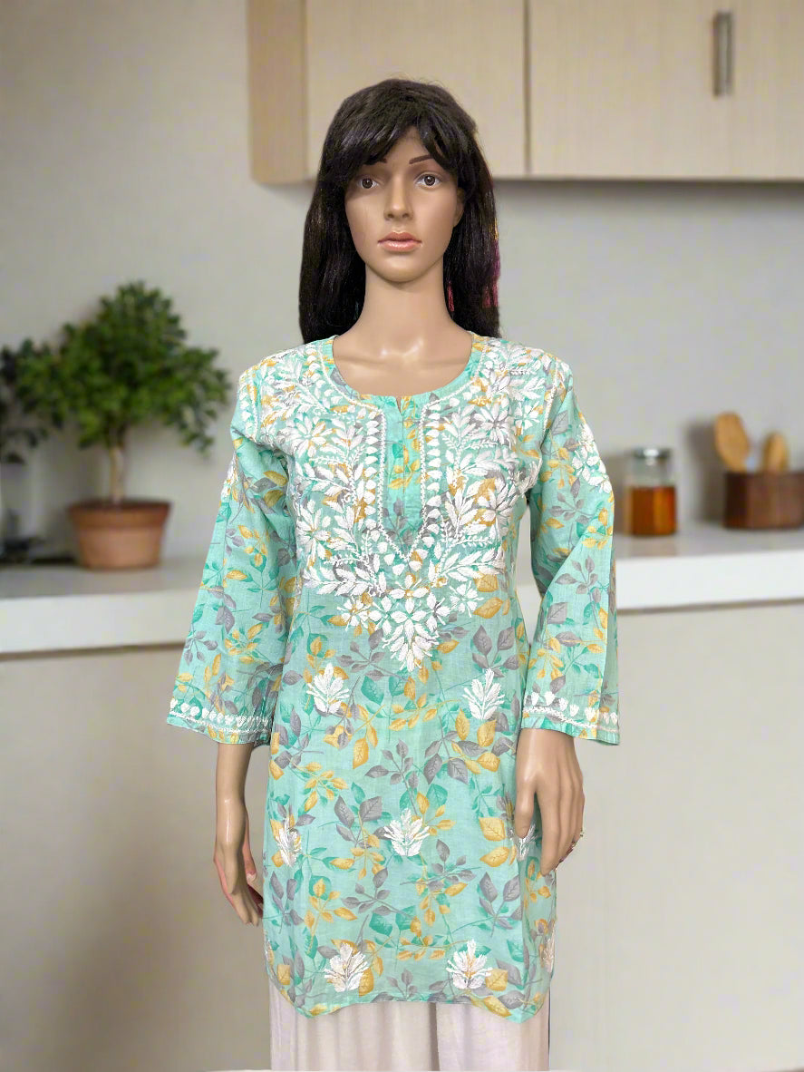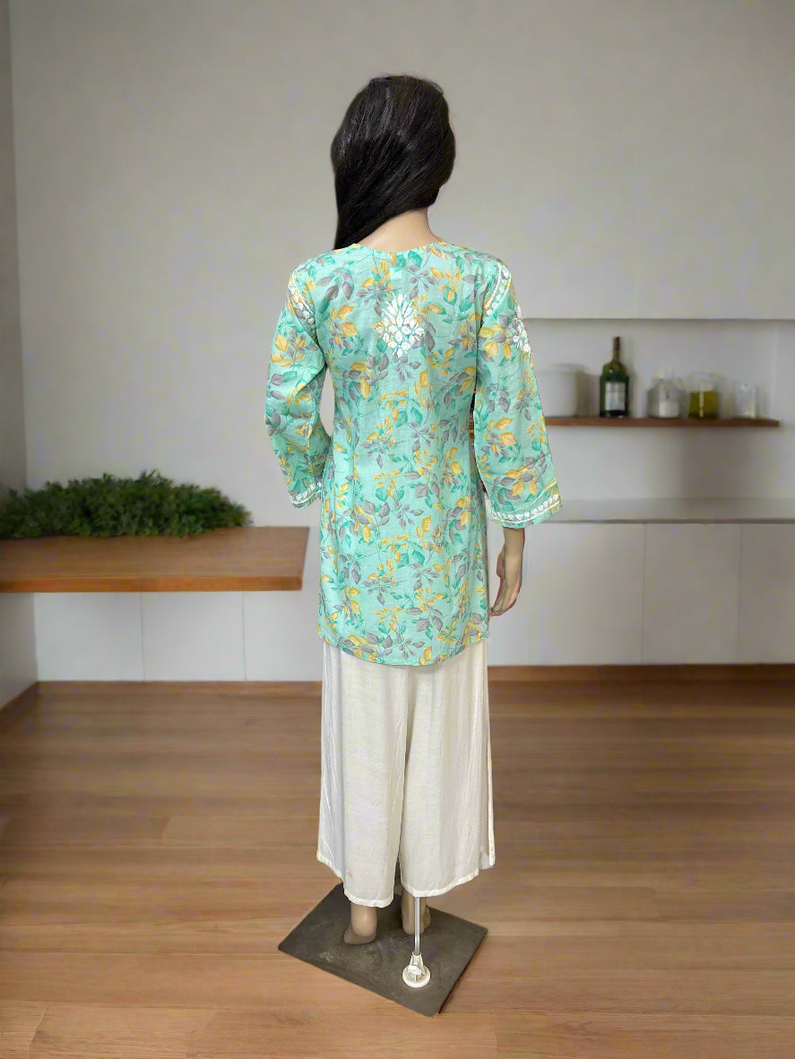 Lucknowi Chikankari Green 'Bahar' Printed Cotton Short Kurti-K000042