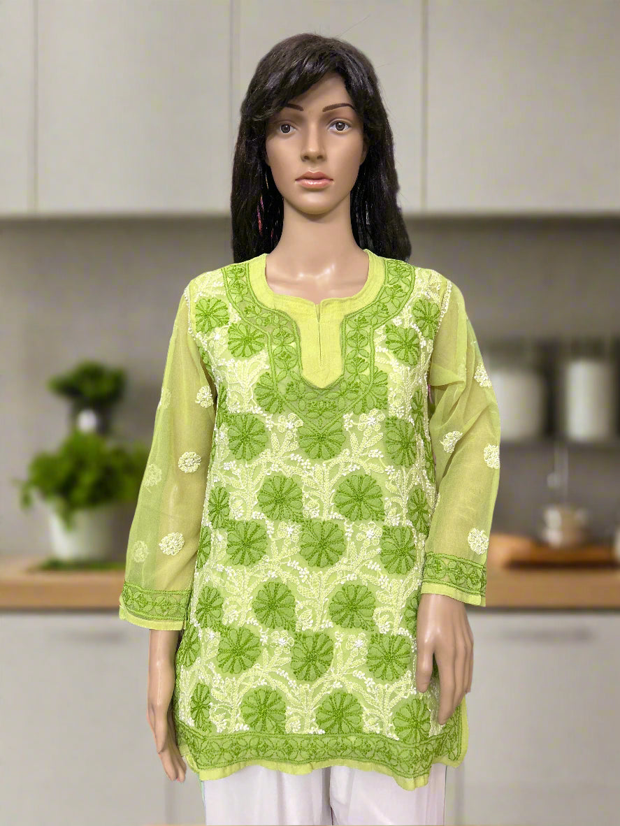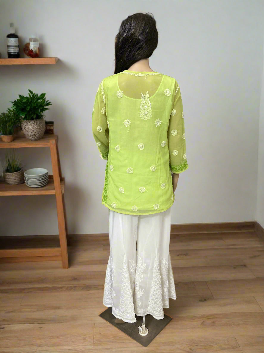 Lucknowi Chikankari Green Georgette Short Kurti-T20002