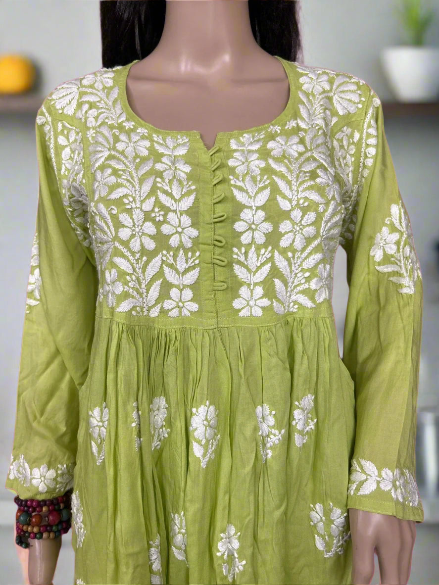 Lucknowi Chikankari Green Modal Short Kurti-T000033